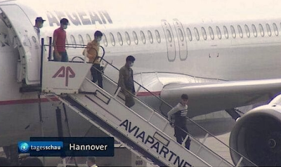 Hier präsentieren sich die "Kinder von Moria", hier zeigt sich die erste Tranche der angekündigten 100 "unbegleiteten Minderjährigen" auf der Gangway, soeben auf einem deutschen Flughafen angekommen, bei ihren ersten tapsigen, unsicheren Schritten.
